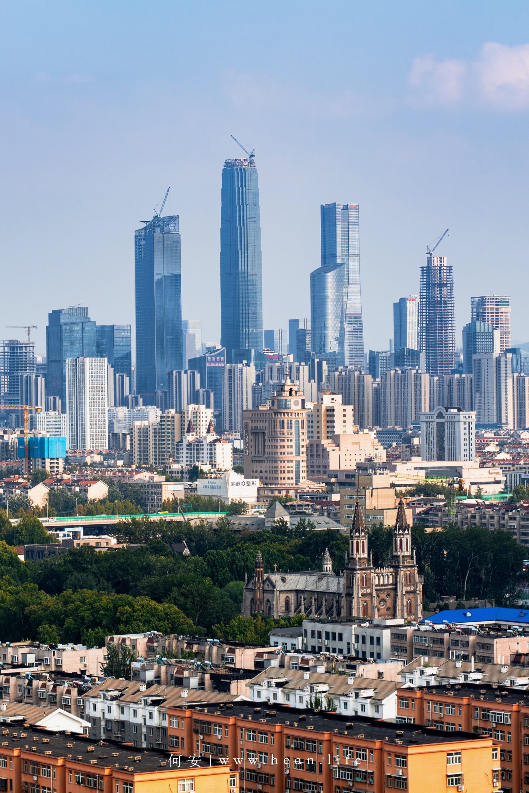 洪家楼教堂的尖塔静静伫立,背后是正在崛起的济南新城 CBD。 一帧画面里,百年与当下同框 —— 历史的厚重与现代的速度交织。 这是属于济南的对比美学。