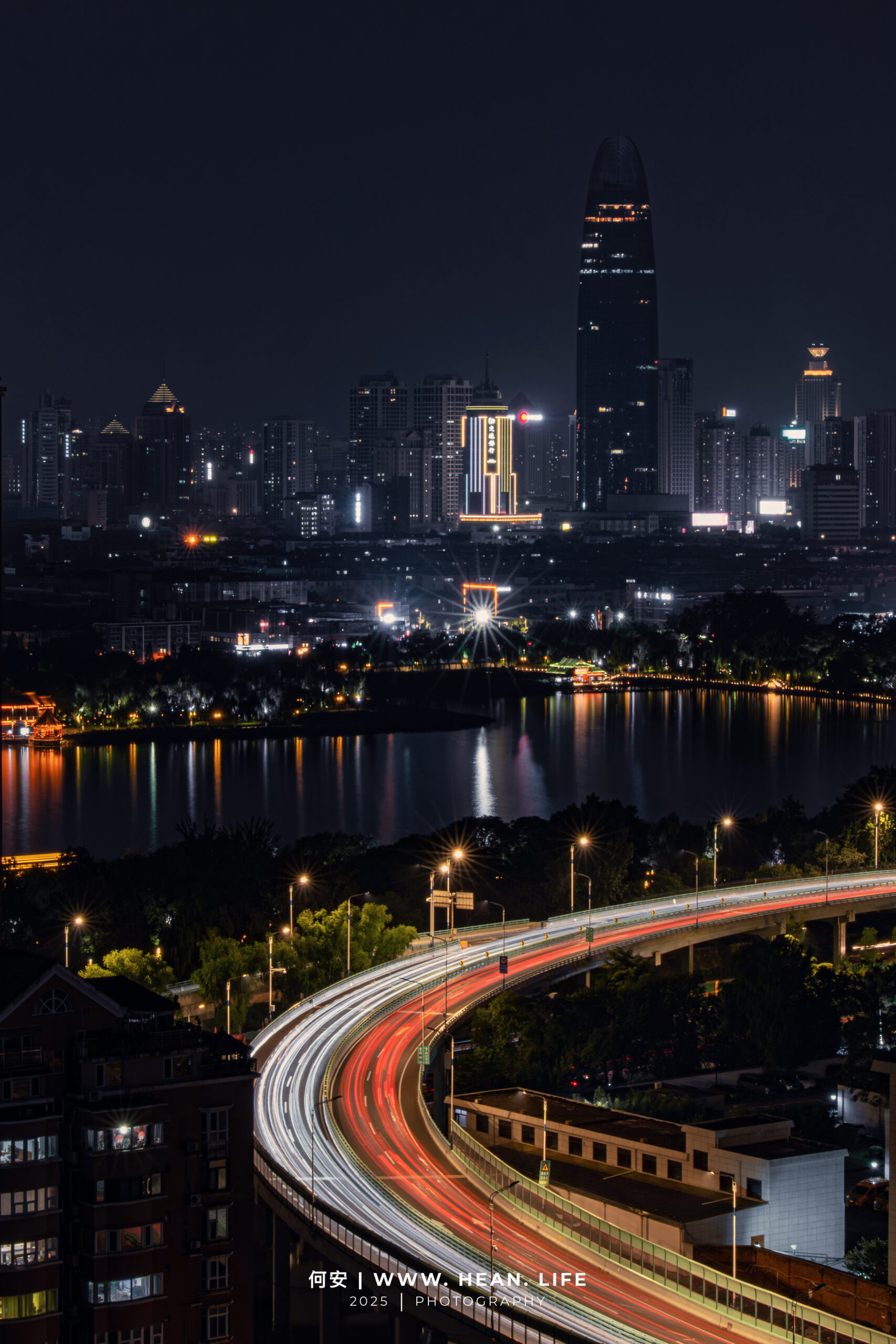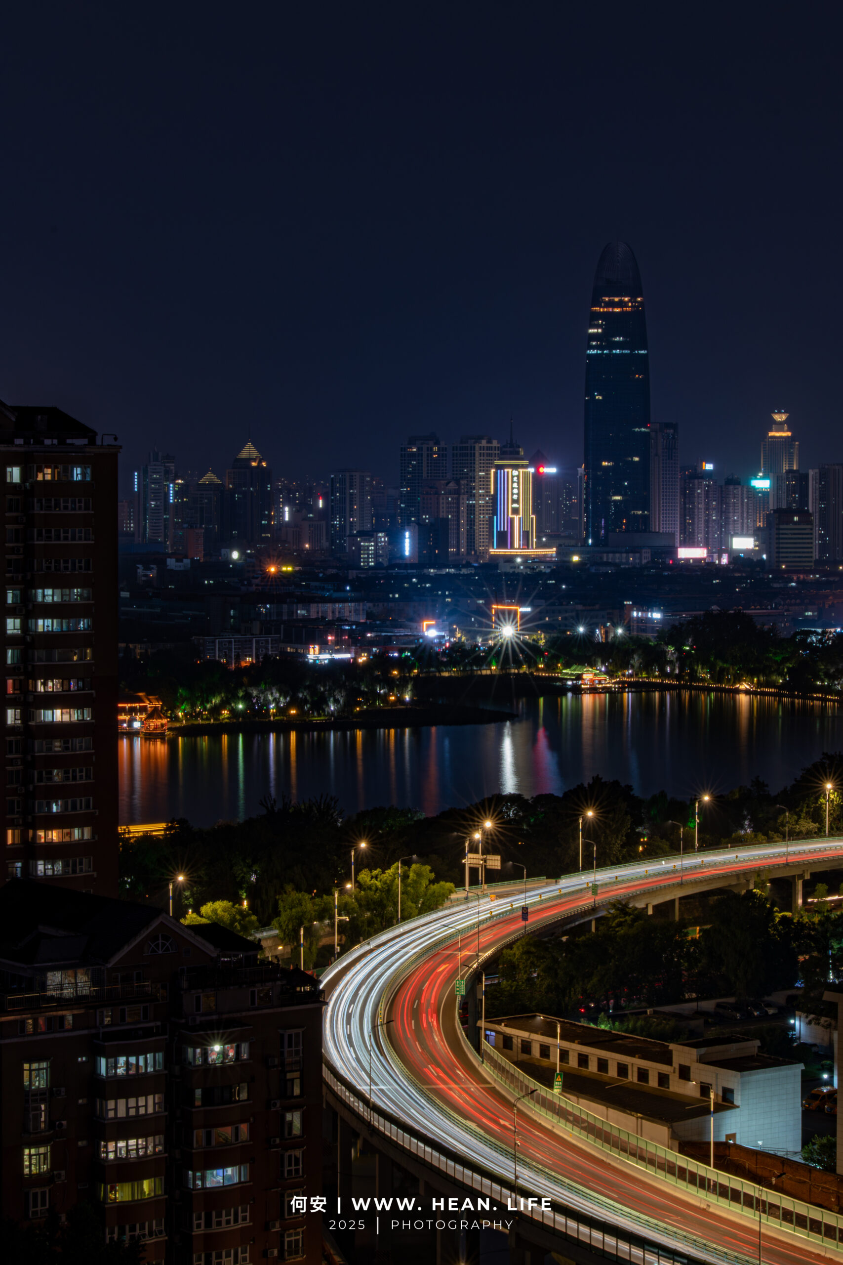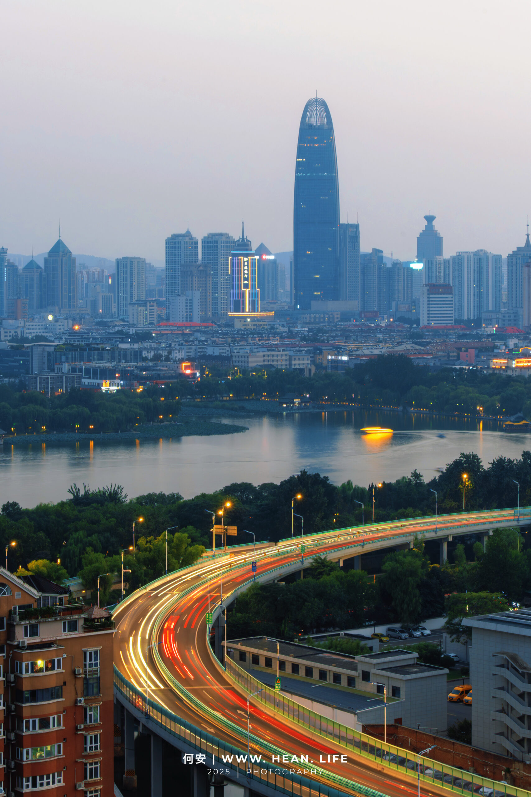 下午守到傍晚,看着C字型高架的曲线慢慢把视线引向老城,桥下胶济铁路的列车每隔几分钟就会穿境而过,动态感直接拉满